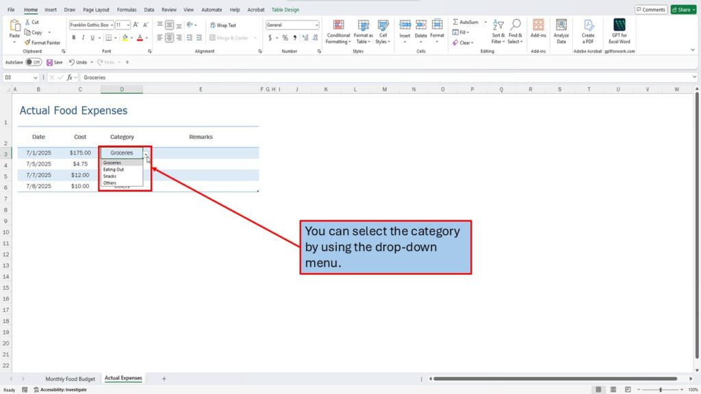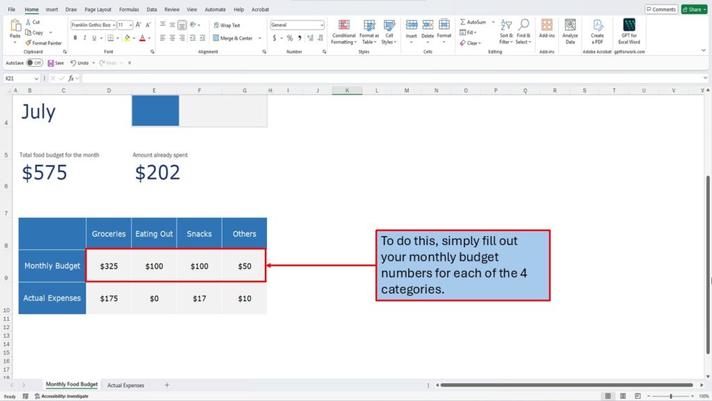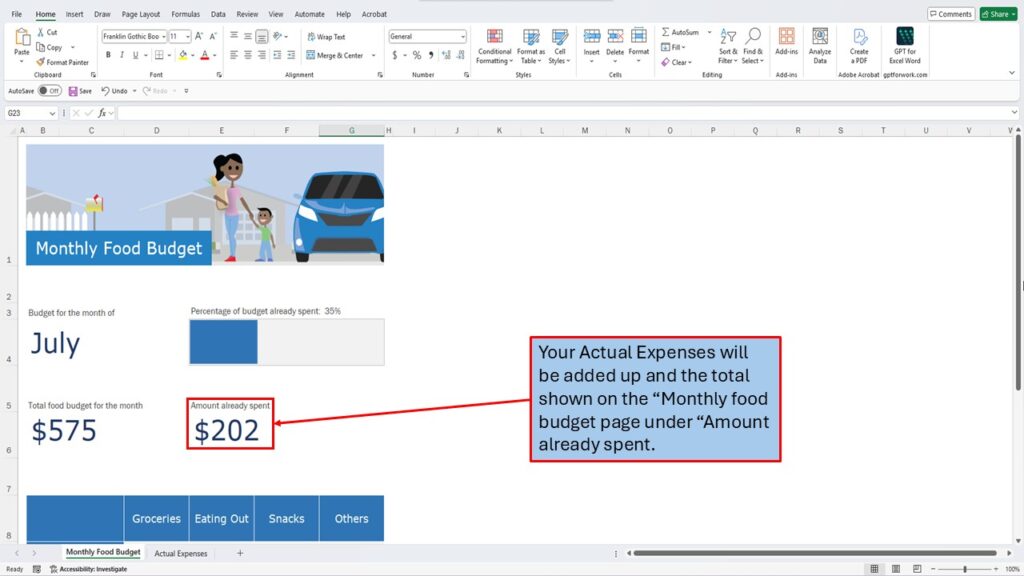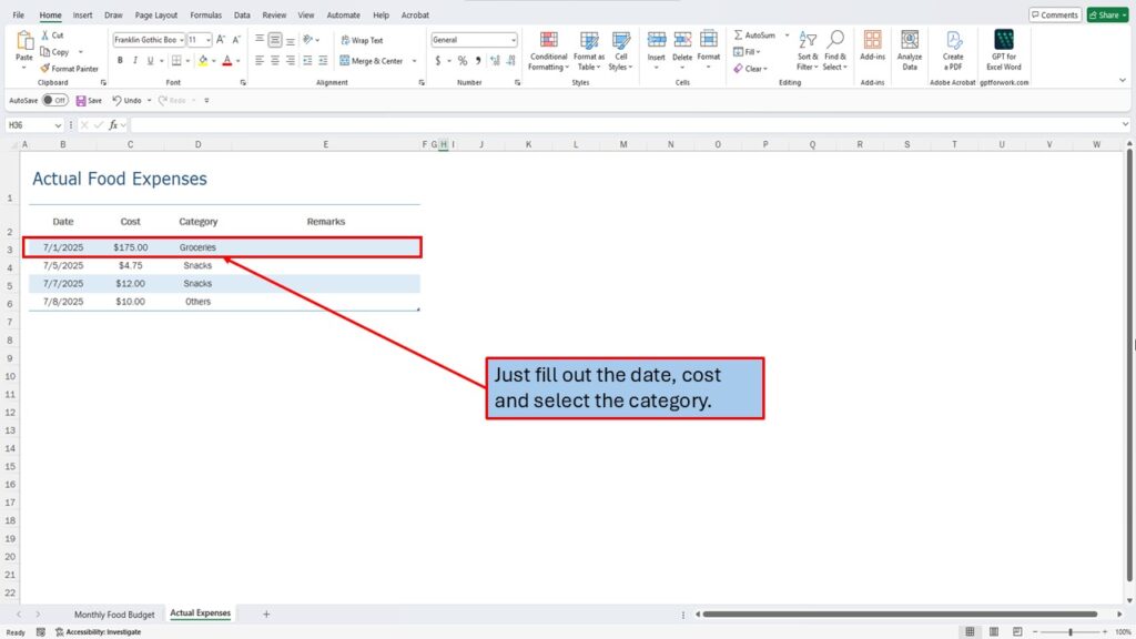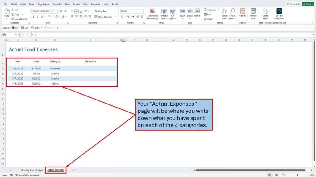 Click on the Actual Expenses sheet/tab. This is where you’ll record your daily or weekly food purchases.