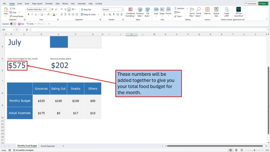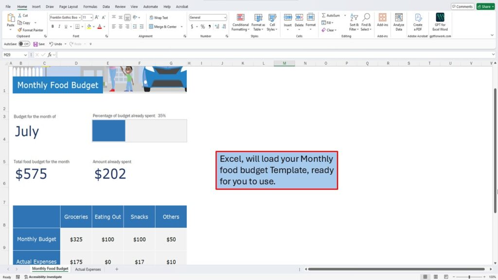 Your Monthly Food Budget Template is now ready to use — preformatted and fully functional.