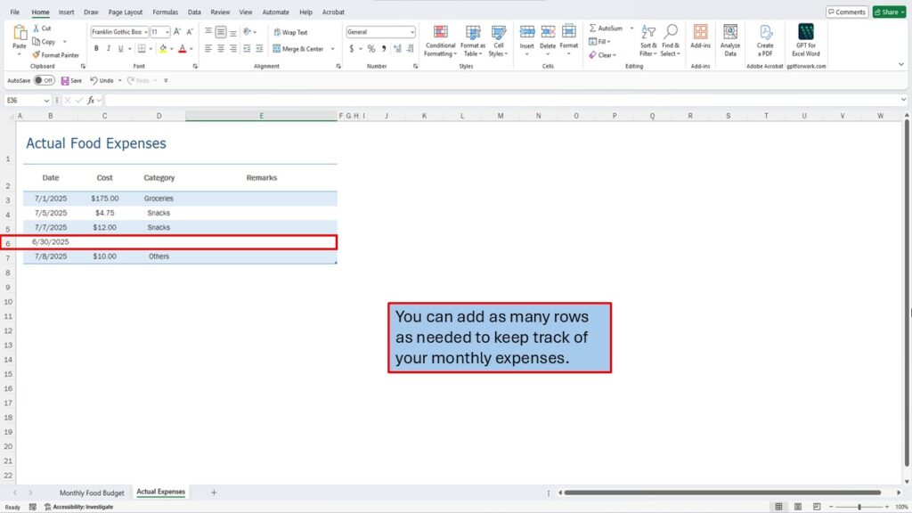 There’s no limit—you can add as many rows as needed to capture your monthly food expenses.