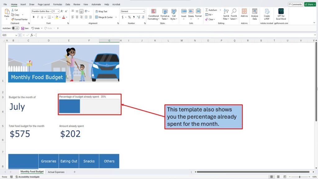 The template also calculates the percentage of your monthly food budget already spent, so you always know where you stand.