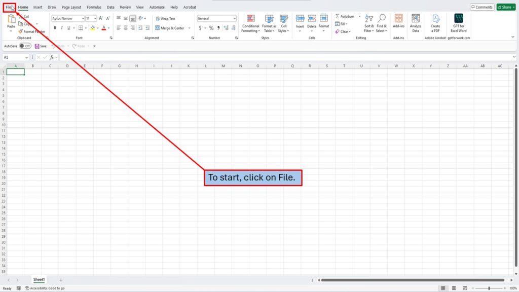 Open Excel 365 and click File in the top-left corner. This opens the backstage view where you can access templates and recent documents.