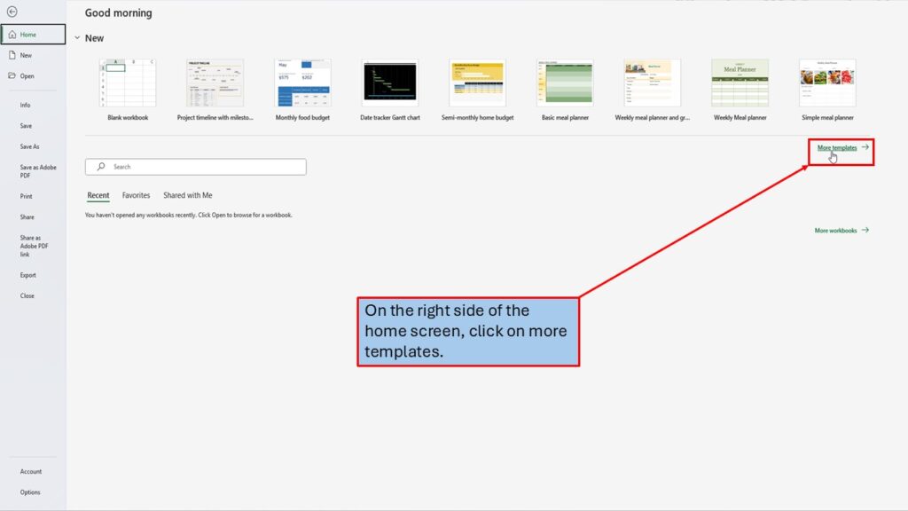On the right-hand side of the home screen, click on More Templates to browse all of Excel’s built-in options.