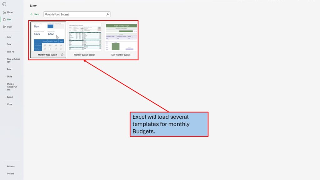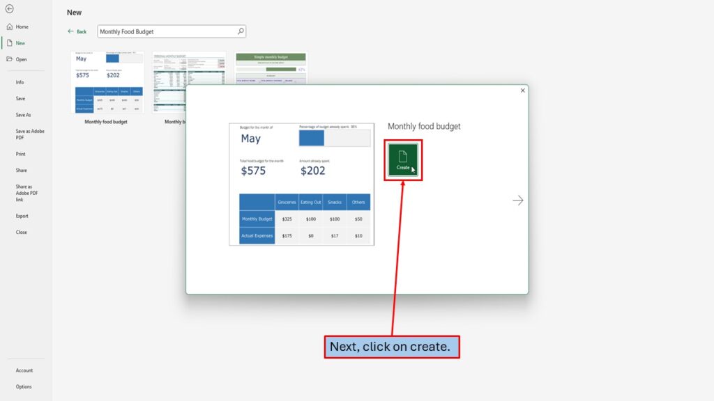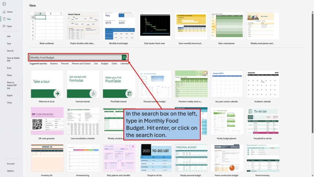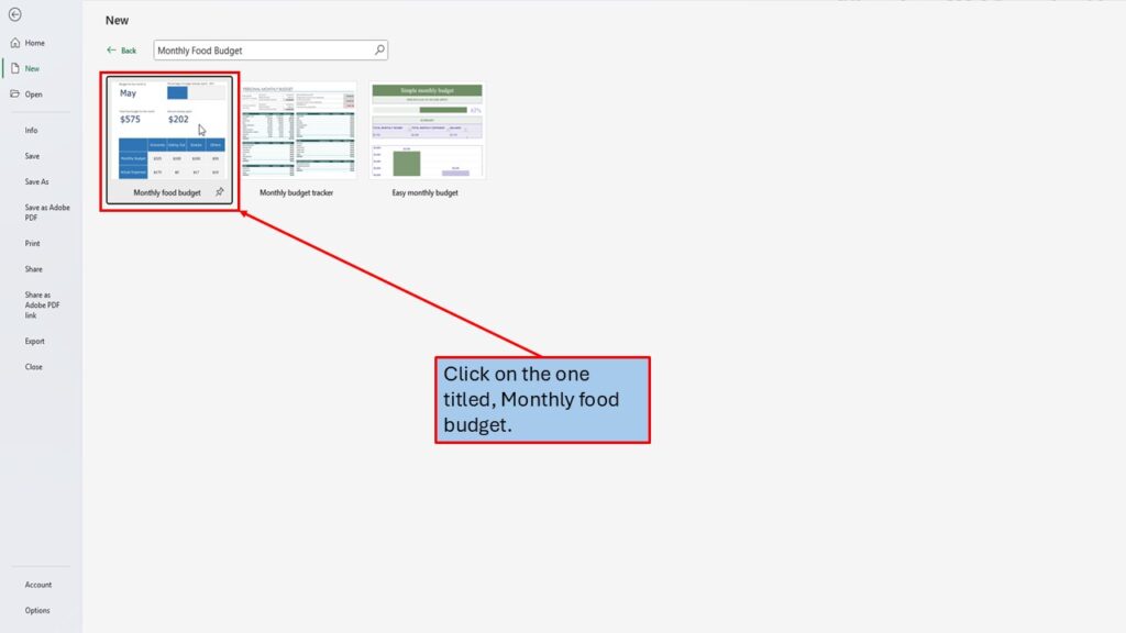In the template search box on the left, type Monthly Food Budget, then press Enter or click the search icon.